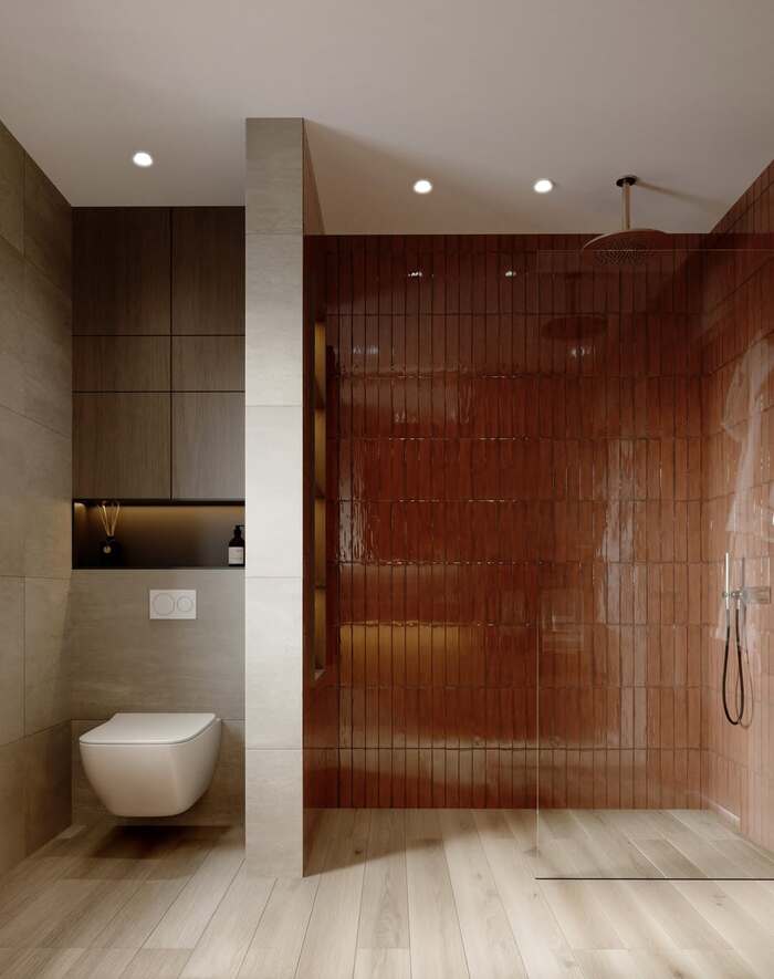 Shiny clay tiles in the shower love a blond wood grain tile floors moment on the main floor. This contrast is friendly and modern. If you’re mixing warm reds and yellow woods, tie them together with a taupe towel or stone tray. Small detail, big peace. Part of why this 10+ bathroom with wood tile floor group feels so balanced.