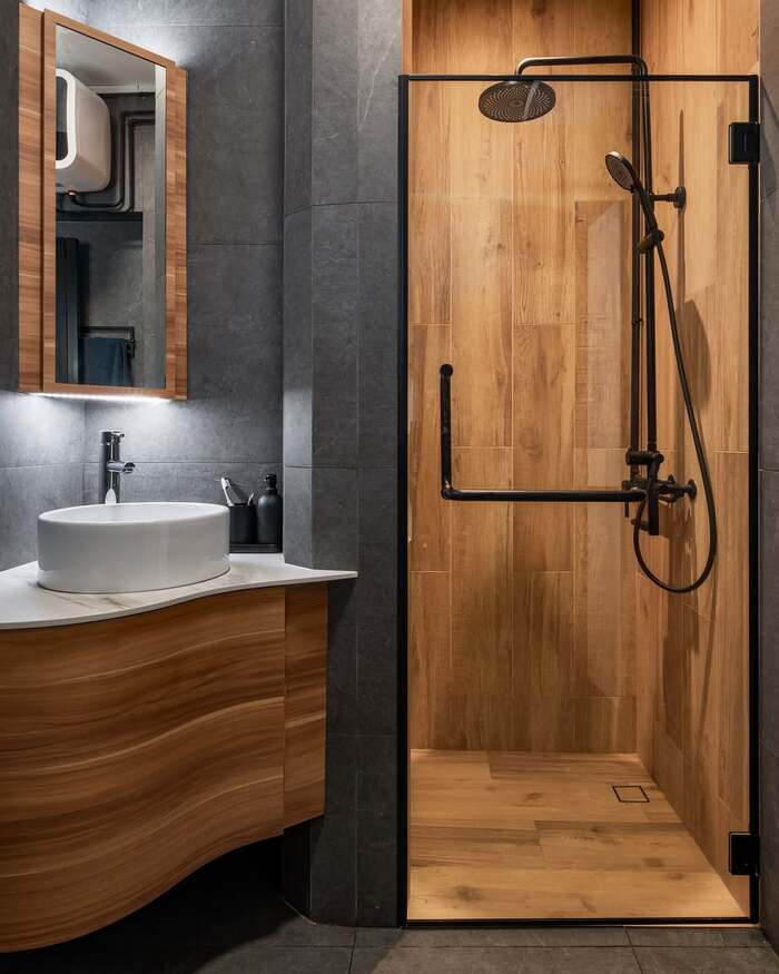 Dark stone walls make the shower feel like a glowing cabin when you wrap it in a wood-look shower floor tile and matching walls. It’s daring but not crazy. Keep glass simple and hardware matte black. Three finishes max or it starts to feel like a sample board gone wild.