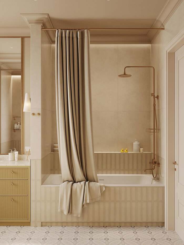 The warm beige surround with brass fixtures is cozy and luxurious at the same time. I like the vertical rib detail along the tub face. It adds texture without chaos. If you want this vibe in your 10+ bathtub tile surround plan, try a satin tile. Glossy can glare under vanity lights. For the tub tile surround here, I’d pick almond grout to keep seams quiet.
