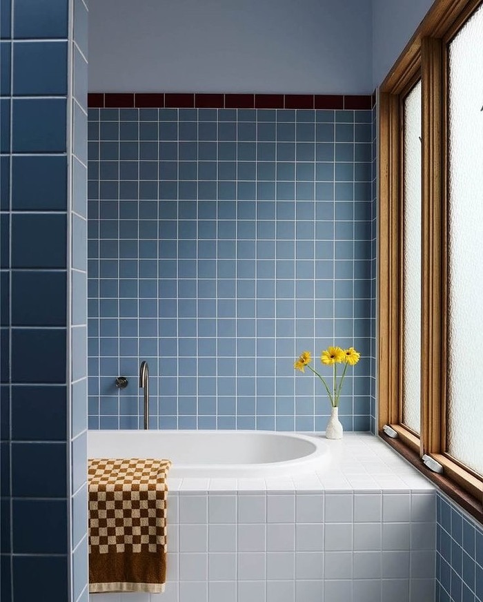 The square blue field tile with white deck is pure happy. My opinion, squares are timeless because the rhythm is clear. For a tiled tub surround, make the outside corners perfect with metal trims or bullnose pieces. Gray grout hides soap marks. Pop a daisy in a bud vase and the tile around the tub becomes a mood.