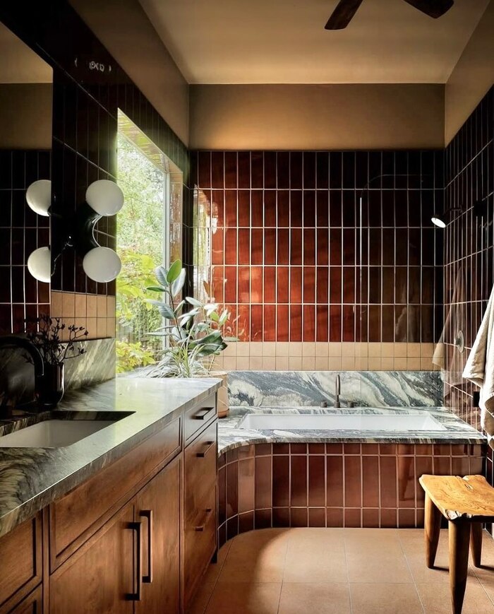 The chocolate-brick vertical tile reminds me of old cafés. So moody and rich. When I pair a deep field like this with a bath tile surround, I balance it with stone veining on the top ledge. The curve at the tub corner is chef’s kiss. If you copy this look for your 10+ bathtub tile surround, dimmable sconces are a must. Shiny tile loves soft light.