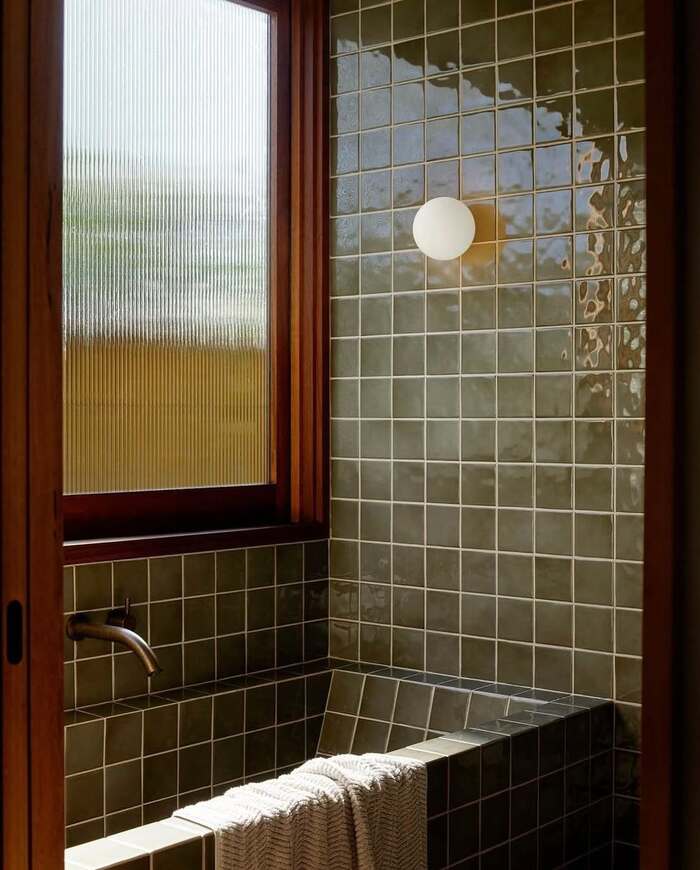Handmade green squares bounce light in such a sweet way. The wavy surface is forgiving, even when your walls aren’t laser straight. Keep grout tight so the tile tub surround doesn’t turn into a checkerboard. Wood window frames echo the warmth and make the room feel grounded.
