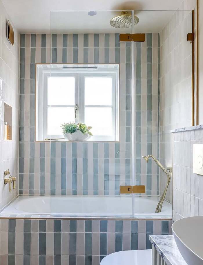 I love this one. The stripe rhythm is tidy and spa-like. Stacking tile vertically stretches the walls, a trick I use in narrow baths. When planning a 10+ bathtub tile surround with stripes, keep the width of each color equal so the pattern doesn’t wobble. A little brass hardware warms the cool palette.