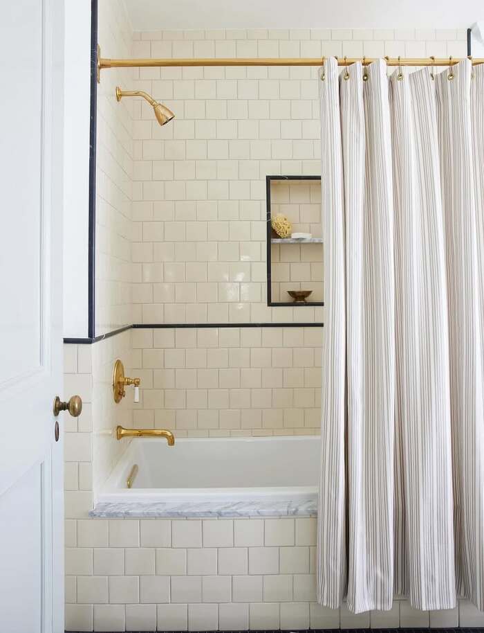 Classic never gets old. The thin black liner at eye level is like eyeliner for the room. It sharpens everything. For this kind of tub tile surround, a marble cap along the deck makes it feel finished. Use unsanded grout around marble edges to avoid scratches.