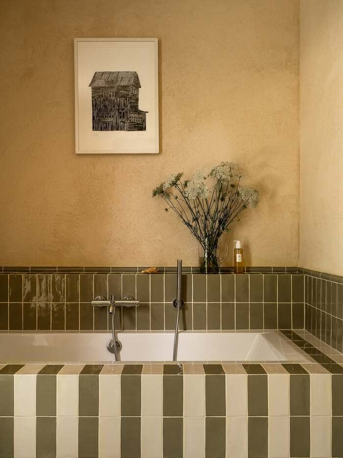 This rustic beauty mixes olive and cream bars, then wraps them around the tub face. If you’re craving a soft, old-world tile bath surround, try limewash paint on nearby walls to echo the organic feel. Keep fittings simple and matte so the tiles get attention.