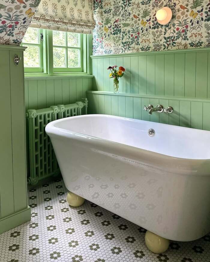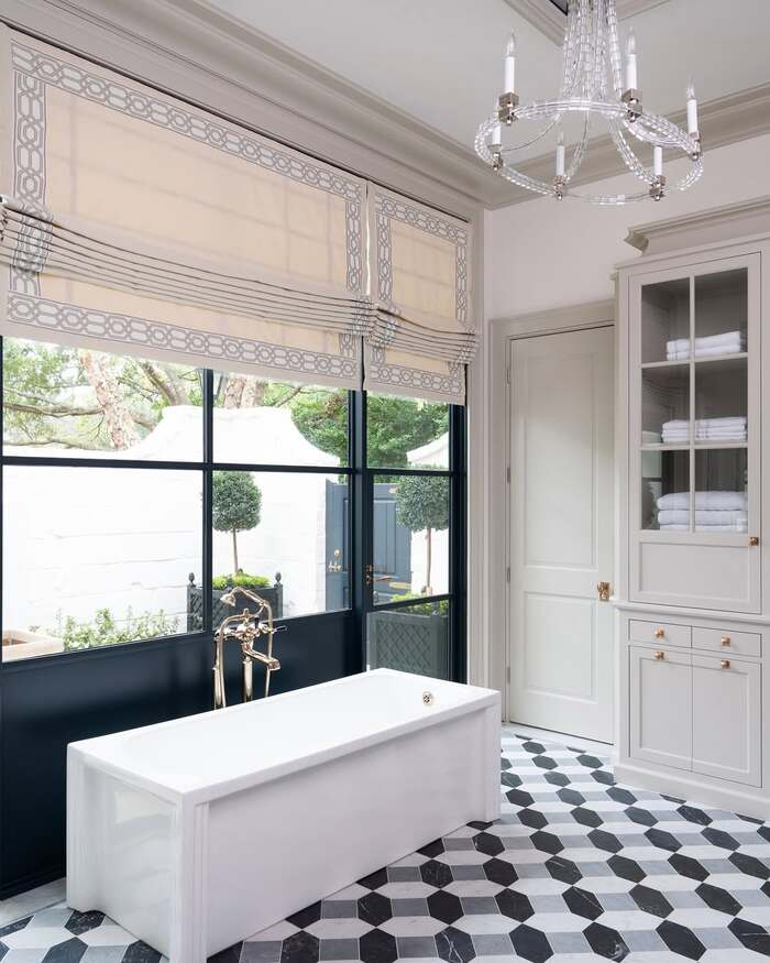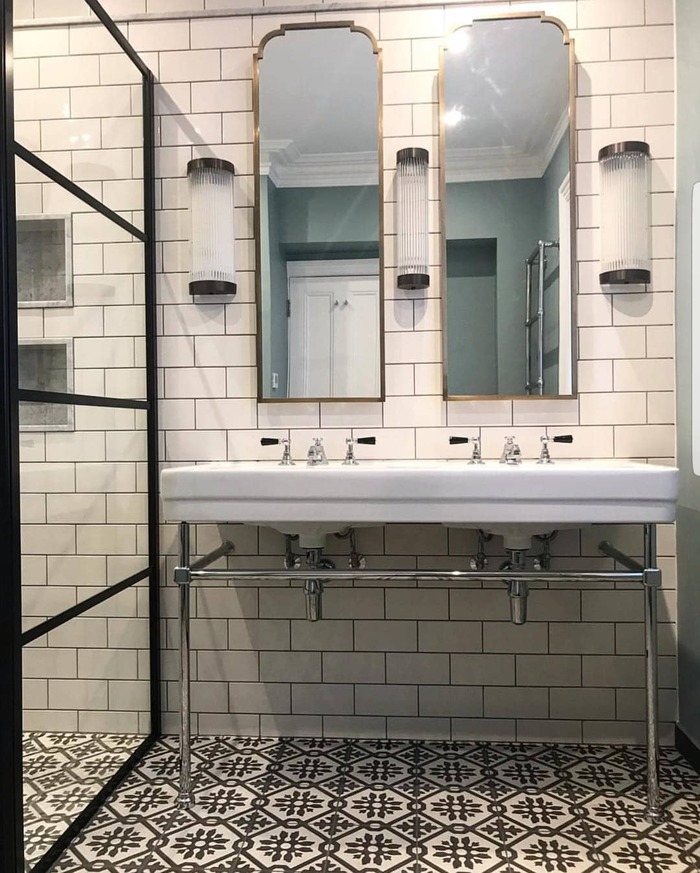 This is my budget trick. Keep walls plain white subway in a relaxed herringbone, then go wild with a black and white bathroom floor tile just in the shower pan. Because it’s a smaller area, you can afford a fancier pattern. Add a matching border at the bathroom threshold to connect both zones.