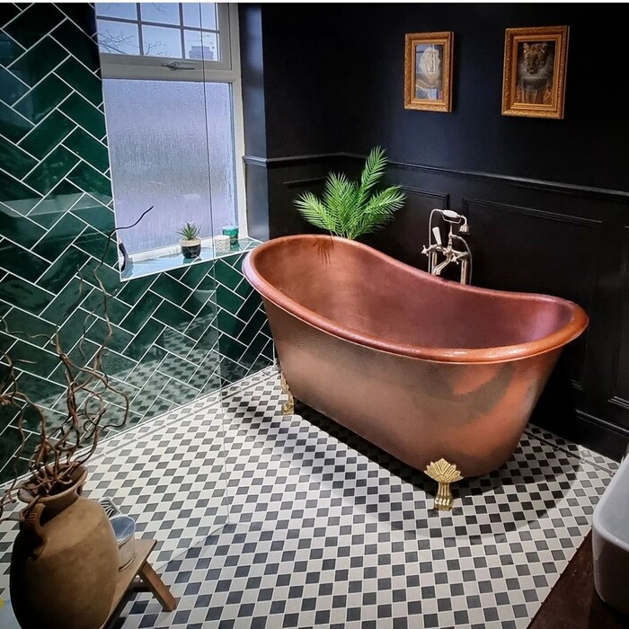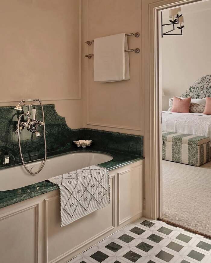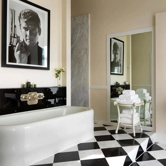That bath with pink walls and bronze fixtures works because every surface stays in the black-white family except one accent. Keep your accent to 20 percent of the room and you won’t blow the palette. A thin stripe of black and white bathroom tiles at wainscot height can also link walls and floor.