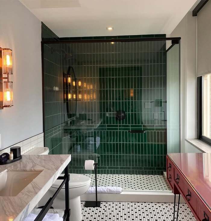 Yes, you can mix color with 10+ black and white bathroom tile without chaos. Here, geometric black and white floor tiles ground the space, while green vertical tiles and a pink vanity bring joy. My confession: I used to avoid color with monochrome floors. Big mistake. A colored vanity makes the black-and-white tile feel intentional, not accidental.