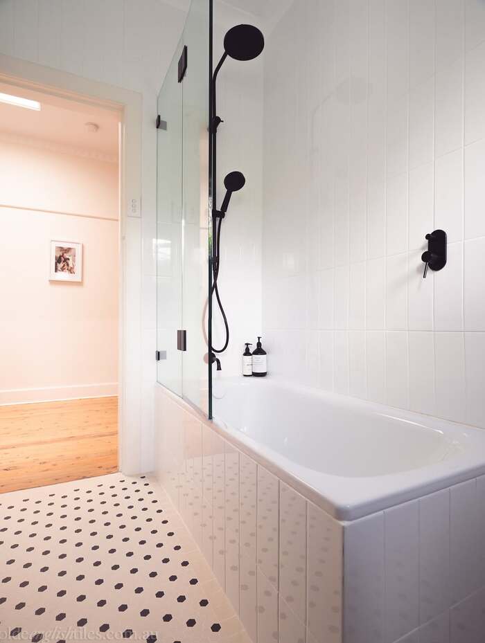 A skinny bath with white subway walls and a patterned black and white bathroom floor tile is a classic space stretcher. Lay the pattern so it runs the long direction, then repeat black fixtures around the room to tie it together. If you want it quieter, choose a black and white shower floor tile in hex or penny scale and keep the main floor graphic.