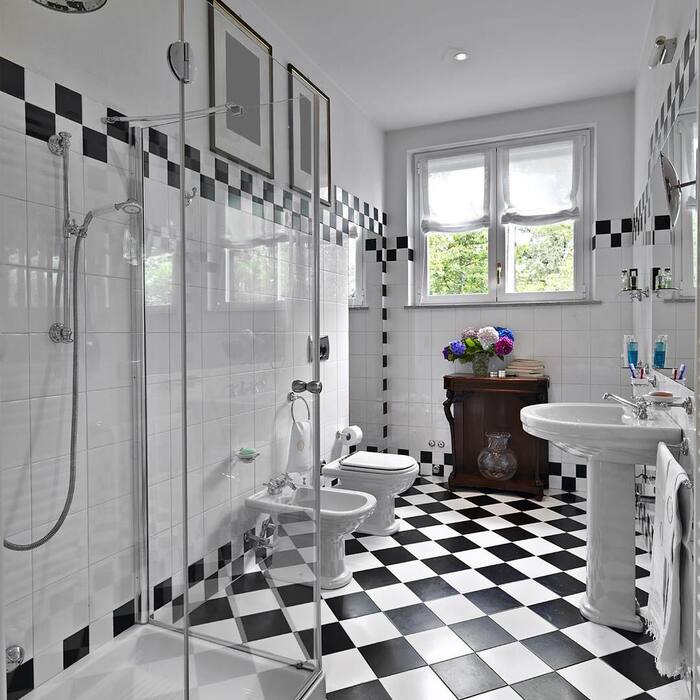 That crisp chessboard floor with glossy white walls is timeless. In a black and white tile floor bathroom, 12 by 12 squares laid on the diagonal make narrow rooms feel wider. My opinion, keep grout thin, then repeat the pattern as a small border near the ceiling. Quick hack, use satin paint on trim to bounce light back onto the floor. Variation count here: try a black and white tile bathroom floor with a matte sealer if you need more slip resistance.