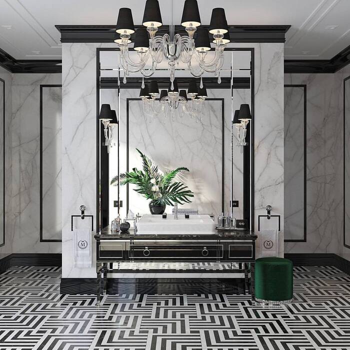 This one is drama city. Geometric maze tile on the floor with marble walls makes a luxury black and white tile floor bathroom without shouting. Keep linens white, skip busy art, and let the pattern do the talking. Personal note, I once tried a striped towel here, and nope. Solid white wins.