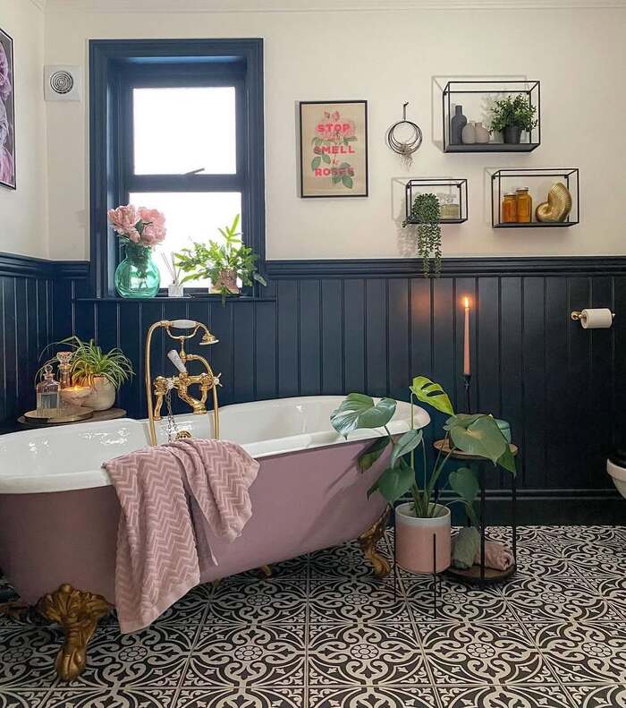 The room with deep charcoal half walls and a vintage tub made me smile. A black and white bathroom tile floor with floral motifs softens the dark paneling so it feels cozy, not heavy. I’d add warm brass taps and a pink towel for a tiny wink. Confession, I once went too matchy and it looked stiff. The fix, bring a plant and one playful print.