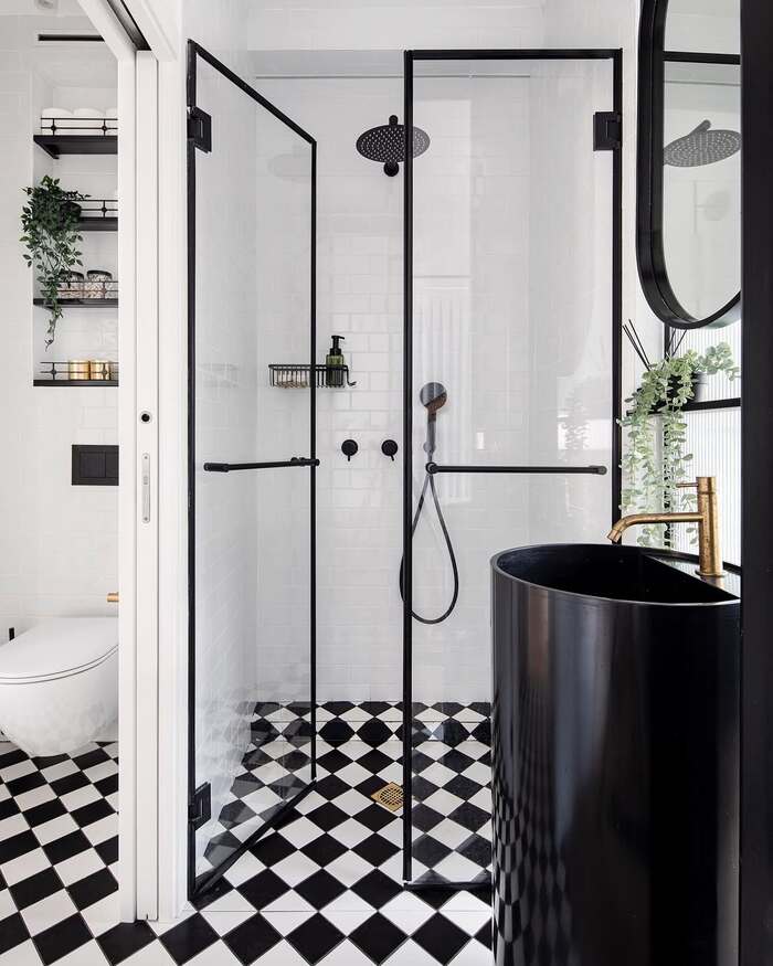 The small-space layout sings because the black & white tile floor runs straight into the shower. Black metal frames echo the grout lines, so everything feels tidy. If you want this clean vibe in your own black and white tile floor bathroom, switch your drain cover to black or unlacquered brass. That little dot matters.