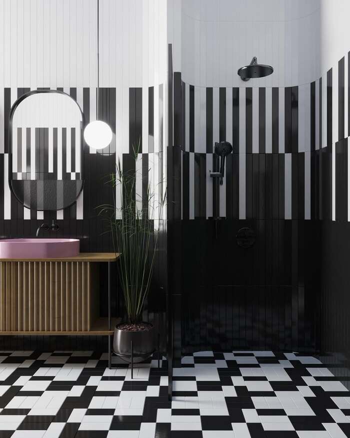 This one is brave and I love it. Vertical wall stripes meet a pixel floor and, somehow, it’s still elegant. When the floor is loud in a black-and-white tile floor bathroom, keep the vanity simple, then let one color pop, like that blush sink. Tip, pick one pattern scale for the floor and a different scale for the wall so they don’t fight.