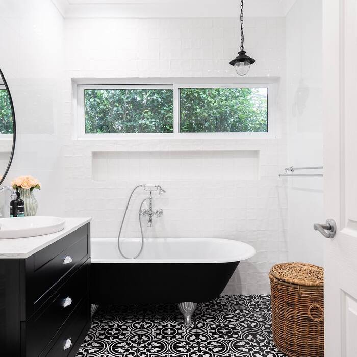 Black vanity, white walls, and a bold black and white tile floor under a classic tub feels like Sunday music. If your room is plain, try an encaustic look porcelain. It gives you the drama of a black and white bathroom floor tile without the high maintenance. Tiny hack, tall baseboards make patterned floors feel custom.