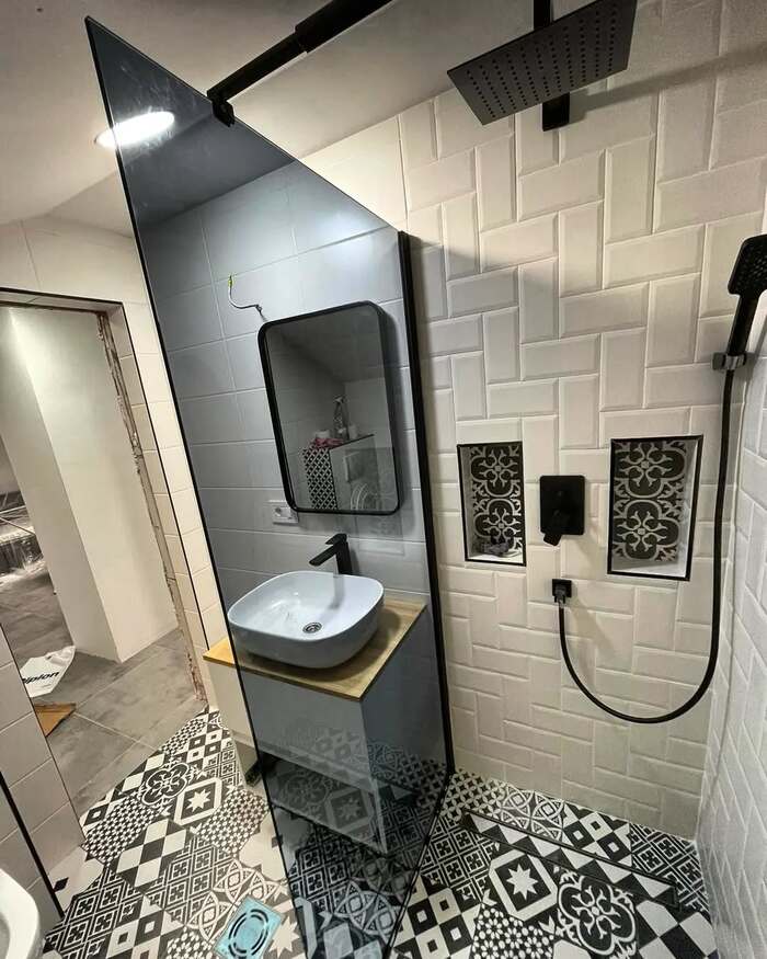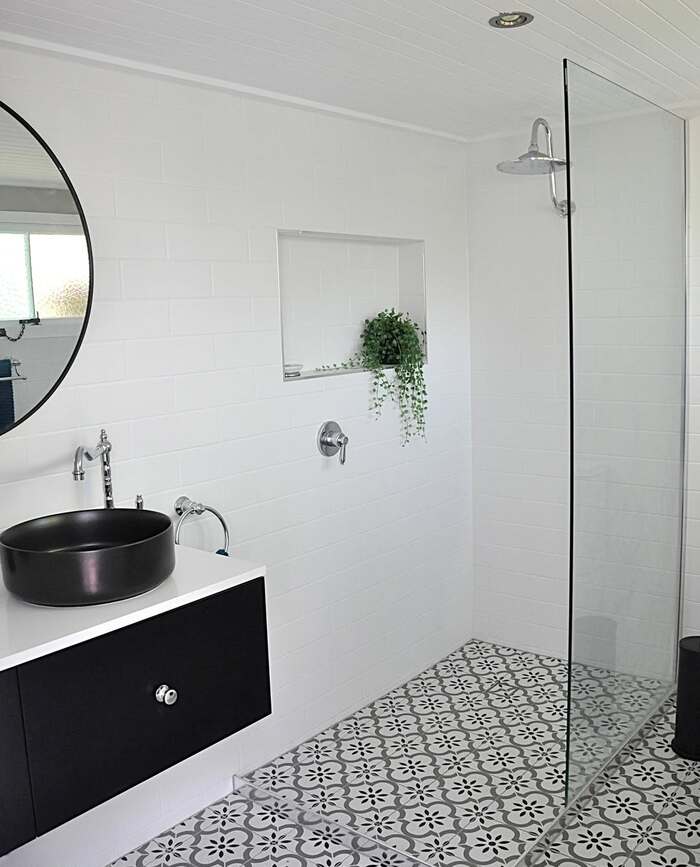 Edges count. Finish tile edges with a slim profile so the black and white bathroom floor tiles look intentional, not cut off.