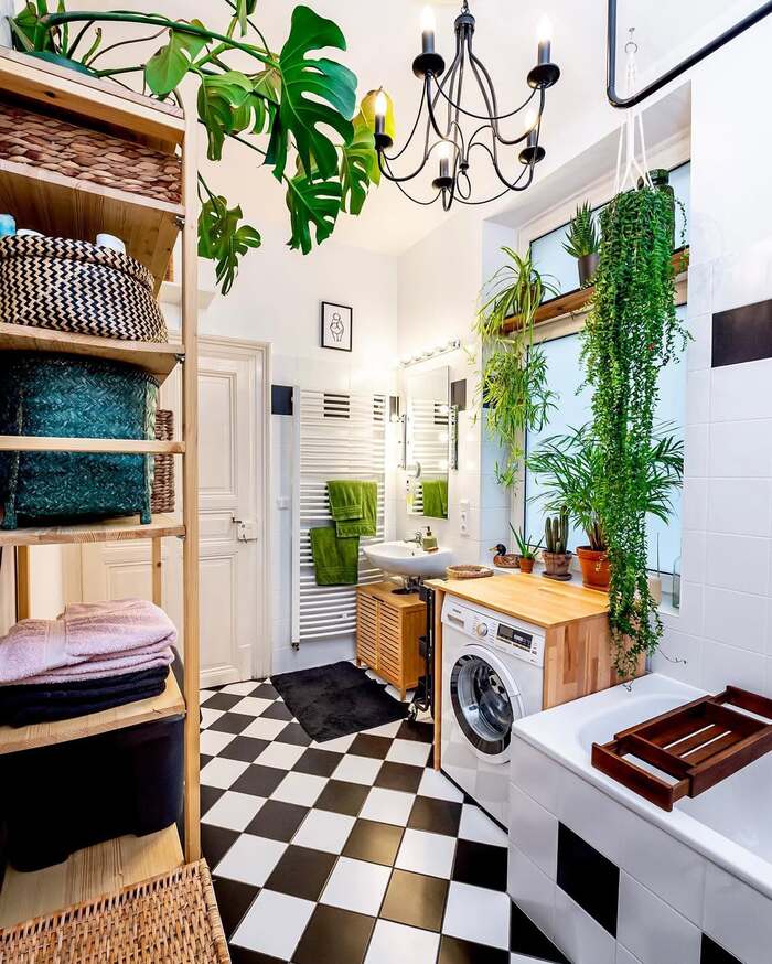 I call this the happy laundry bath. The checker black and white tiled bathroom floor is classic, the greenery makes it breathe, and the butcher-block counter warms the whole scene. If you own renters’ shelves, try baskets that echo the floor’s geometry. Cheap, easy, so good.