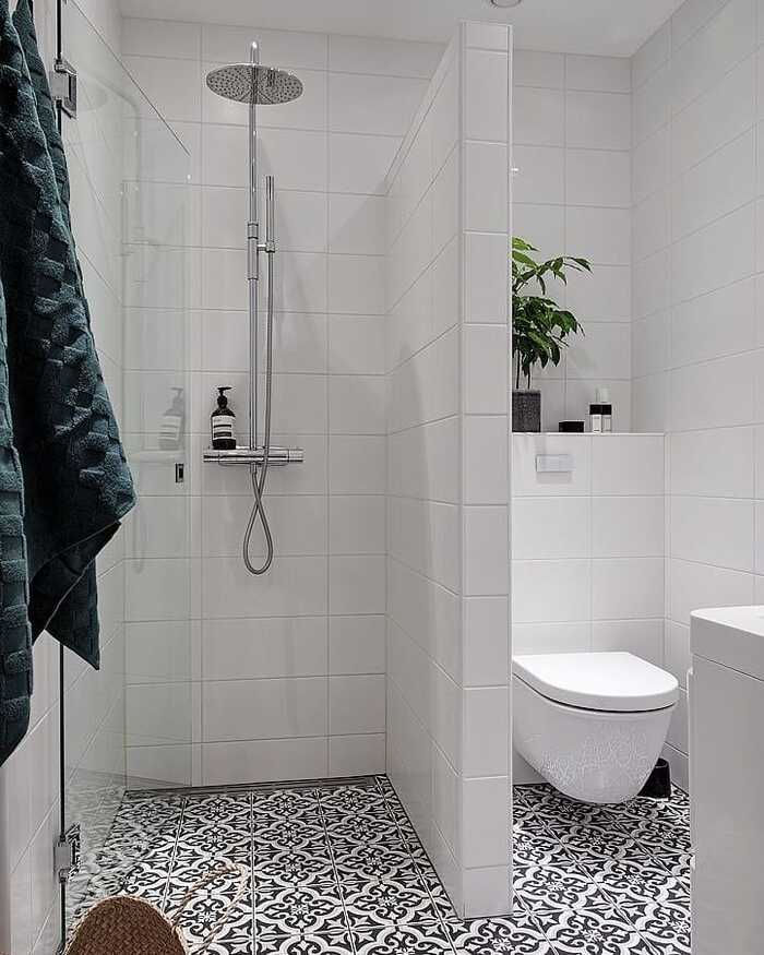Another favorite, a small bath with simple white walls and a gentle black and white bathroom floor pattern. This is the calmest version of the style. Keep fixtures chrome or stainless, then add one leafy plant high on the ledge. After years in design, I swear a single plant can finish a room faster than any decor haul.