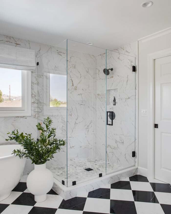 That glossy checkerboard with veined marble is pure hotel energy. The 10+ black and white tile floor here feels chic because the squares are large and set on the diagonal. Diagonal always lengthens a narrow bath. Pro tip from too many installs. Use soft gray grout so the joints don’t shout. Variation to try at home. A classic checkerboard floor with honed tiles, not polished, for less slip and more warmth.