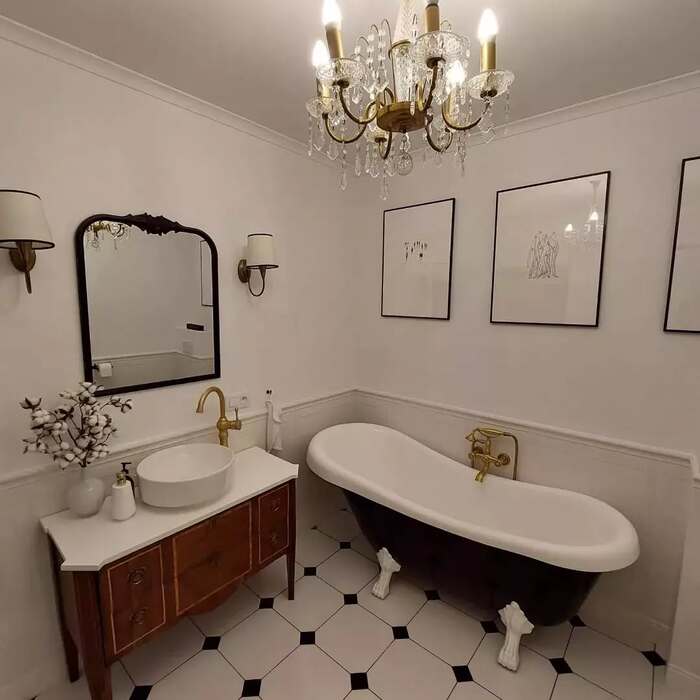 Those tiny diamonds under the tub are quiet but strong. The 10+ black and white tile floor acts like a textured rug. Keep the walls plain and add natural blinds or a linen shade to warm it up. If you prefer something bolder, swap the tiny diamonds for a bigger geometric black white floor and push the pattern.