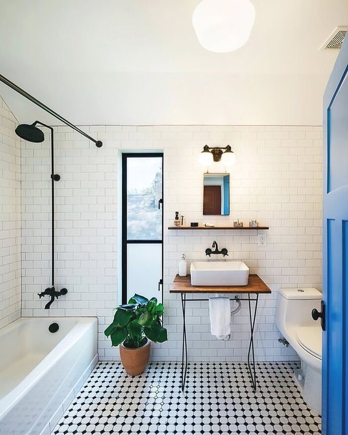 Warm the palette. Wood stools, woven baskets, or brass taps keep a 10+ black and white tile floor from feeling cold.