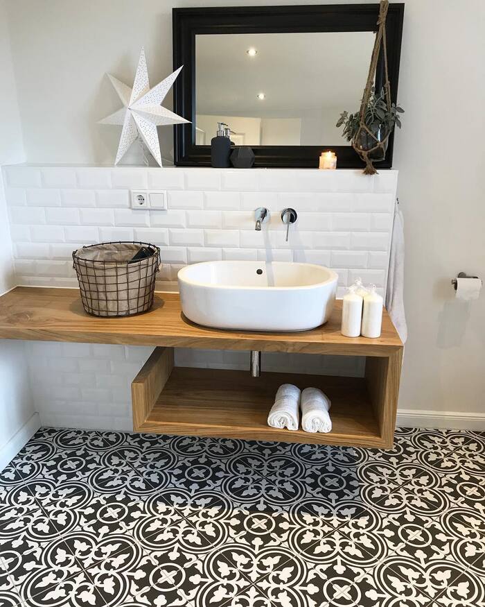 Cement looks romantic without being fussy. That swirling pattern is a great way to soften all the straight lines. The 10+ black and white tile floor anchors the light wood shelf and floating sink. Seal cement twice. Trust me, toothpaste is savage. Variations to pin. patterned black and white tile floors, Moroccan style black and white floor, graphic black-and-white tile flooring.
