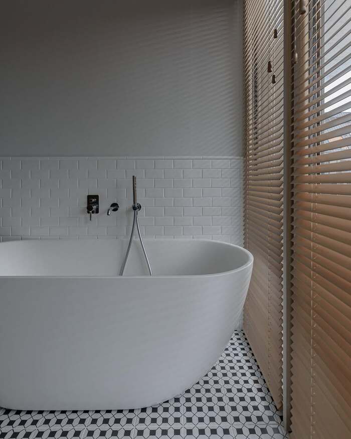Minimal tub corner with quiet geometrics