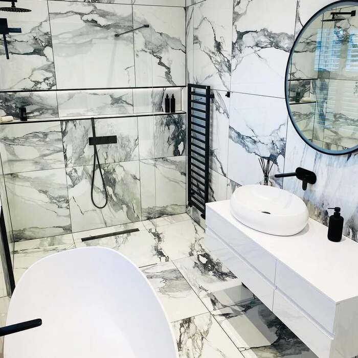 This one is drama queen in the best way. Giant marble tiles with dark veining run up the wall and across the room. The trick is restraint elsewhere. The 10+ black and white tile floor is already talking loud. So faucets stay simple, hardware thin, towels plain. Variations. marble black and white floor, high contrast stone flooring, modern monochrome tile floor.