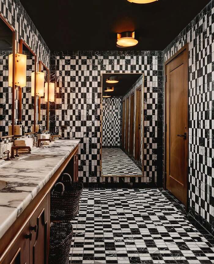 This check-on-check design is moody and glamorous. I’d use it in a powder room or a home bar bath. To keep it from feeling busy, set a single warm bulb and add baskets to bring in texture. The 10+ black and white tile floor here proves scale can be small if your lighting is soft. Try calling it tiny checkerboard floor tiles when you shop.