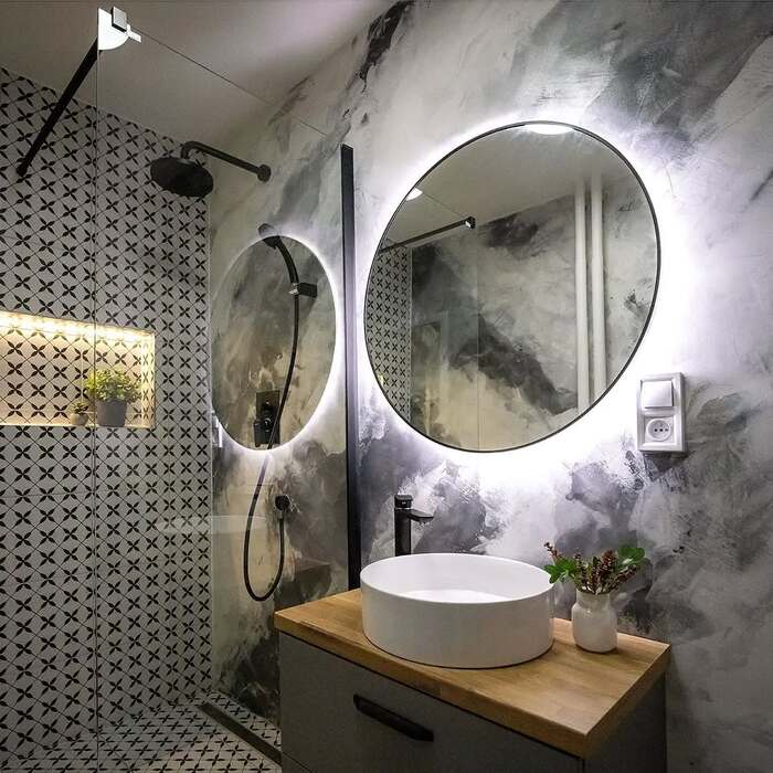 Floral cement pattern with wood shelf vanity