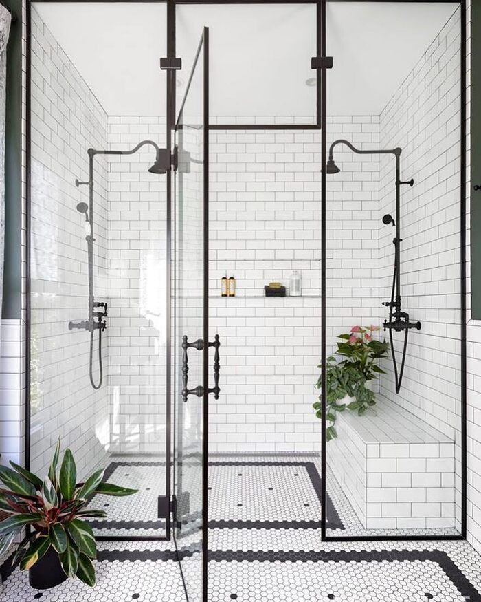 This shower shows a sweet layout trick. White hex field, black hex border, then tiny black dots spaced like confetti. It frames the bench and feels like a custom rug. Extending the border to the main room ties everything together. This is still a 10+ black and white tile floor, just more detailed. Search terms. hex tile black and white floor, bordered mosaic floor, subway walls with mosaic flooring.