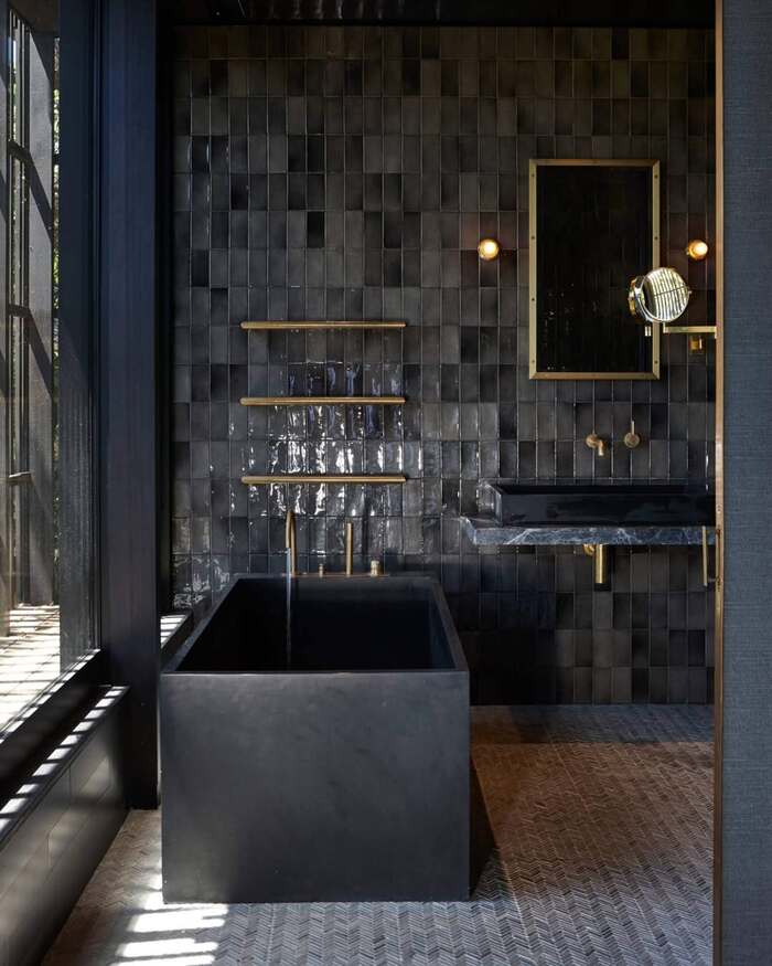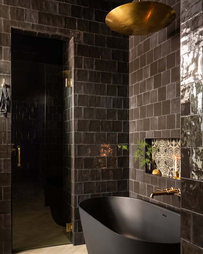 Handmade zellige is like eyeliner for your bathroom. The slight waves catch light, so a black tiled bathroom never goes flat. Add unlacquered brass and you’re golden. I repeat this combo a lot in client homes. Use a penetrating sealer on day one. With 10+ black shower tile in zellige, sealing prevents mineral rings and keeps that inky sparkle.
