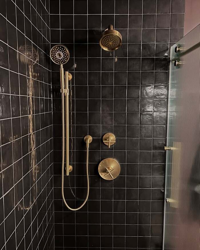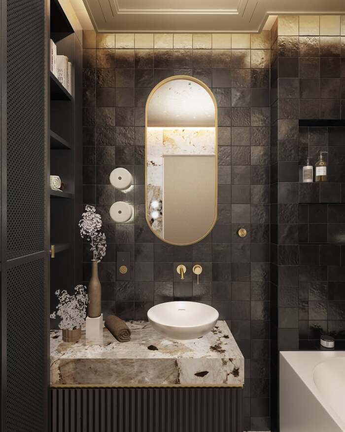 That little vanity with gold trim next to the black squares? Chef’s kiss. Do a creamy stone counter with brown and gray veining to bridge the warmth of the metal and the cool depth of the wall. Repeat the metal tone in your shower hardware so the 10+ black shower tile feels connected to the sink zone. Consistency is the cheapest luxury.