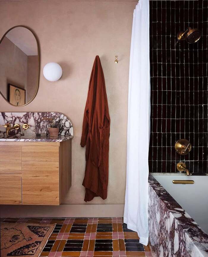 The shot with the clay walls and burgundy robe made me grin. You can totally cozy up black shower tiles with wood grain and terracotta accessories. Use black subway shower tile inside the tub-shower and run a marble curb to tie it together. Add a cotton shower curtain so the hard surfaces get a little softness. It’s like espresso with cinnamon.