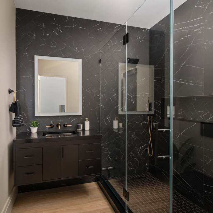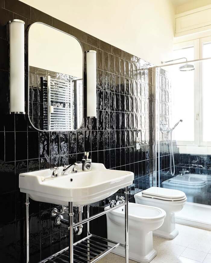 • Lighting: one overhead, one face-level. Put both on dimmers. Black tile for shower walls loves layered light.