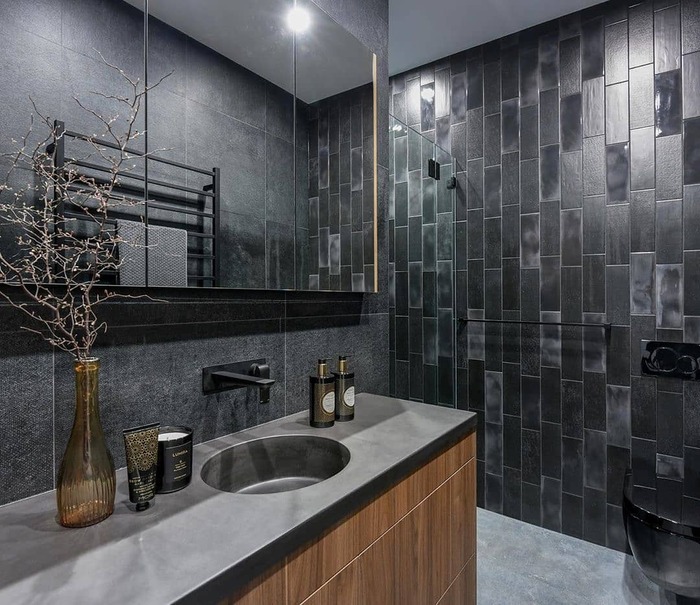 Another Insta save that surprised me was mixing large concrete-look slabs with vertical glossy fingers. The trick is tone matching. Keep both a graphite base. Then break it up with a wood vanity so the room doesn’t feel like a cave. I like a black tile shower floor in small hex, which gives traction and echoes the lines. Use a warm LED bulb temp so skin doesn’t look blue.