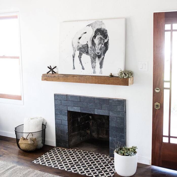 That small-scale tile with a raw beam on top is so warm. For a 10+ black tile fireplace like this, mix a satin black tiled fireplace surround with a reclaimed oak mantel. Satin hides dust and soot better than high gloss. Keep grout charcoal, not white, or you’ll be scrubbing on Sundays. Variation ideas to copy: black tile hearth in a fun pattern rug shape, black fireplace tile inside the firebox frame for depth.