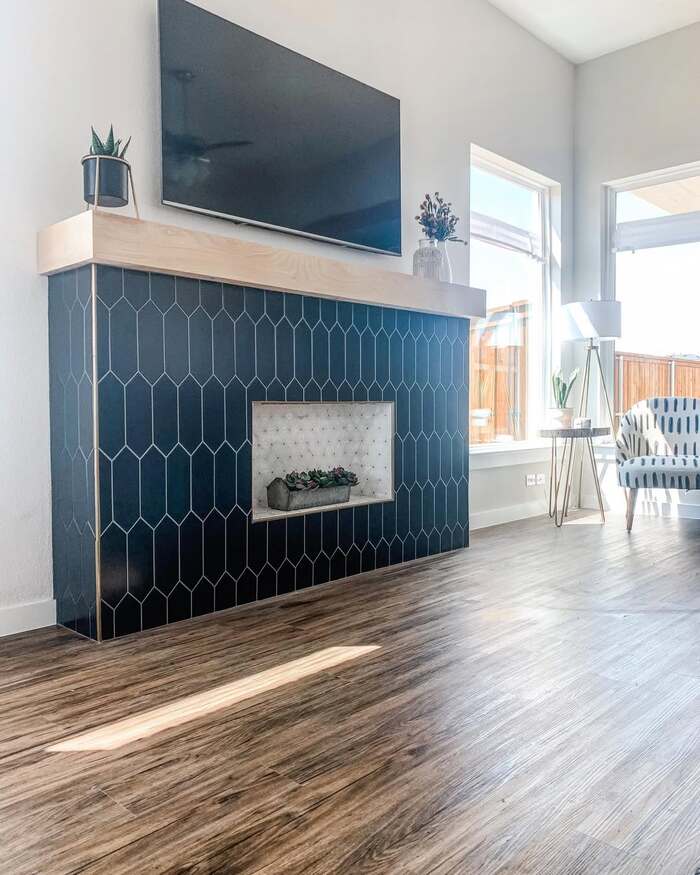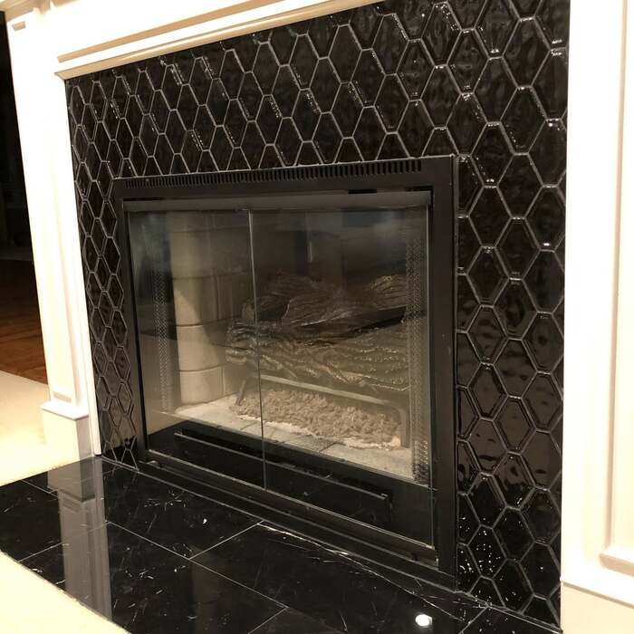 The tall hex pattern gives a modern vibe without feeling cold. For a 10+ black tile fireplace, an elongated shape softens big boxy walls. Use a warm gray grout so the pattern reads, but doesn’t scream. If you’ve got kids, seal the grout twice. Ask me why. Let’s just say slime parties happen. Variations: black fireplace tile surround, matte black tile fireplace.