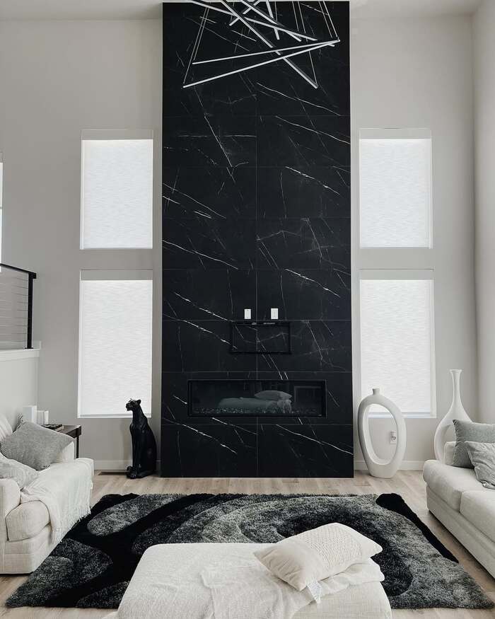 This one made me gasp at midnight. Giant porcelain panels are heavy, but they’re a dream for maintenance. Fewer grout lines. When I spec a 10+ black tile fireplace in slabs, I plan outlet placement early so you don’t cut through that beautiful vein. Pair with low sofas so the height doesn’t feel bossy. Variations: black marble look fireplace, large format black fireplace surround.