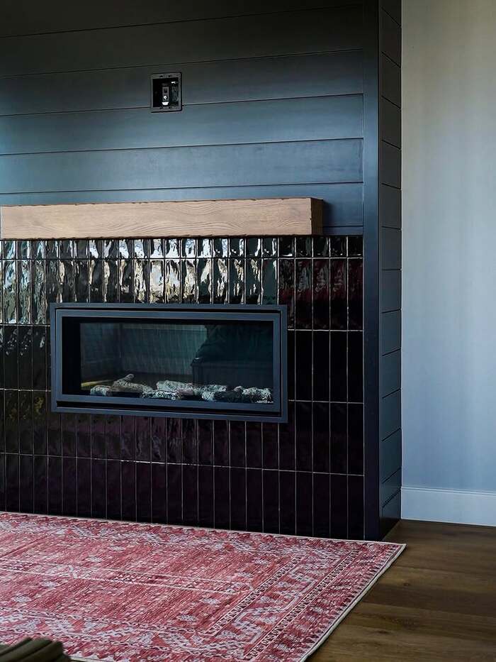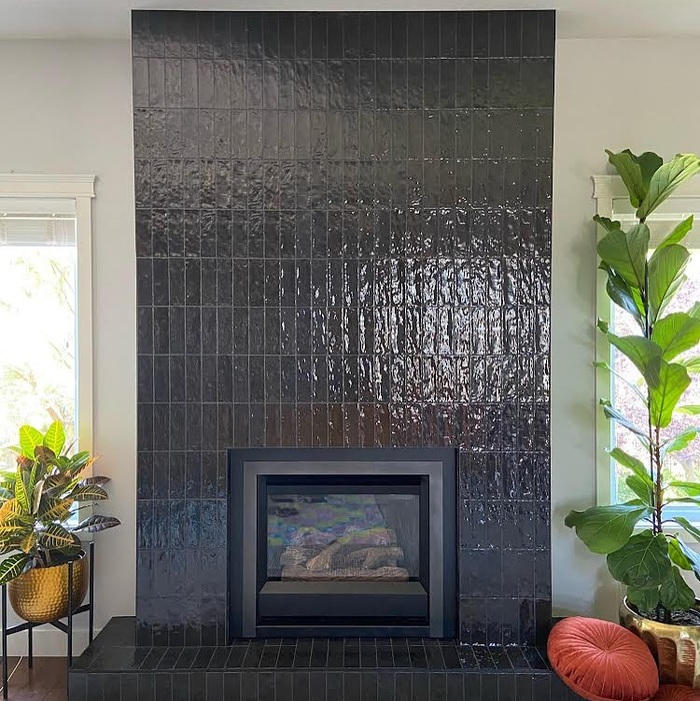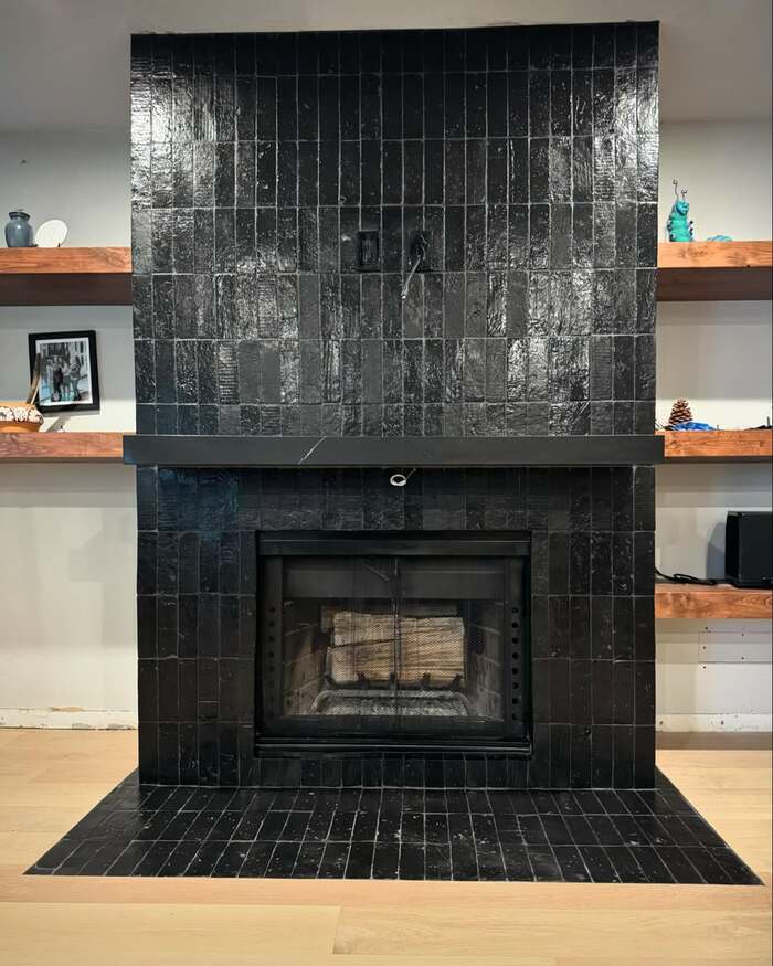 The big glossy zellige wall is dramatic but not noisy. Light hits those wavy faces and the room shimmers. If you attempt a glossy black tile fireplace, add dimmers. Bright light can glare. I use a leveling system so the surface stays flat. Also order 10 percent extra because shade variation is real. Variations: black tile surround, glossy black tile fireplace, black tiled chimney face.