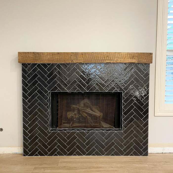 Herringbone never gets old. It brings movement without clutter. Use a 2 by 8 ceramic so the zigzag feels strong. I cut tiny triangles at the corners to keep the frame tight. For a 10+ black tile fireplace, I like medium gray grout. White grout can read like zebra stripes. Variations: herringbone black tiled fireplace, black subway tile fireplace.