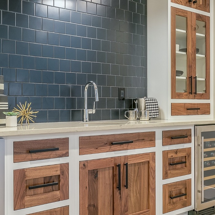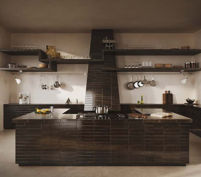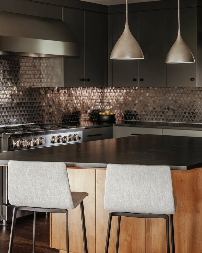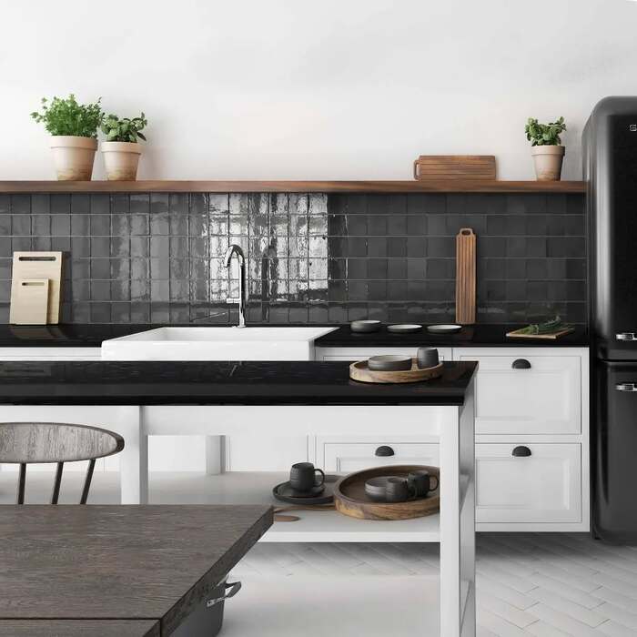 In several photos the black tile has a hand-made ripple. For a dining room, try a small tiled panel behind a buffet or console, not the whole wall. The soft reflections make candles look like tiny stars. That’s textbook organic modern dining room charm. If tile isn’t happening, fake it with square-grid art. It sells the same structure in a lighter way and still hits that modern organic dining room ideas vibe.