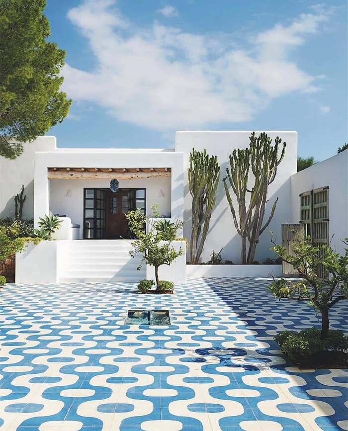 Those big curvy squares make the patio move, almost like tide lines. Use this 10+ blue and white tile style when you want energy without clutter. Keep furniture slim, plants tall, and the walls plain white. A bold blue-and-white tile floor needs breathing room. Personal rule. Three planters max, or the pattern starts yelling.
