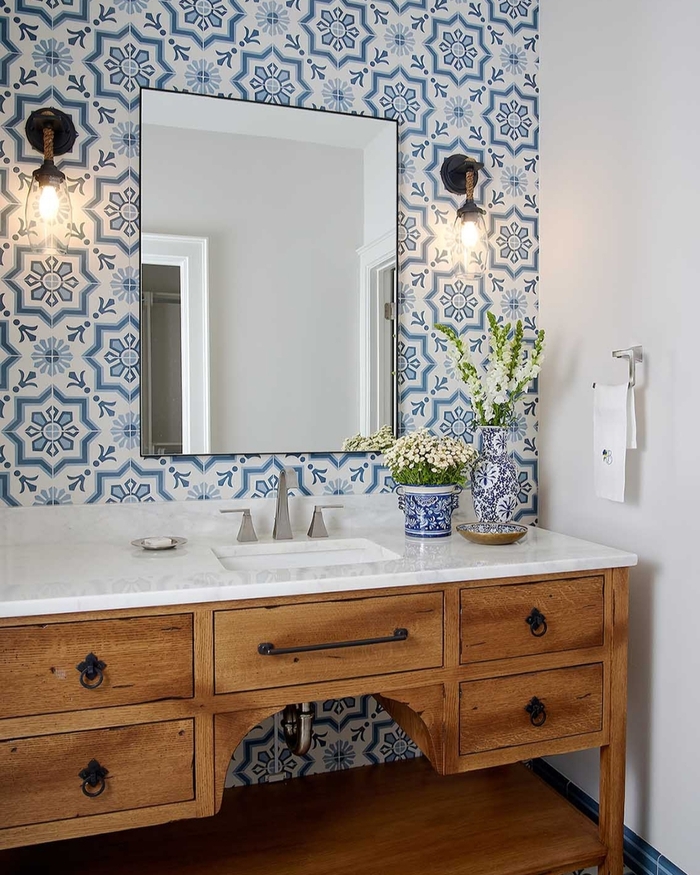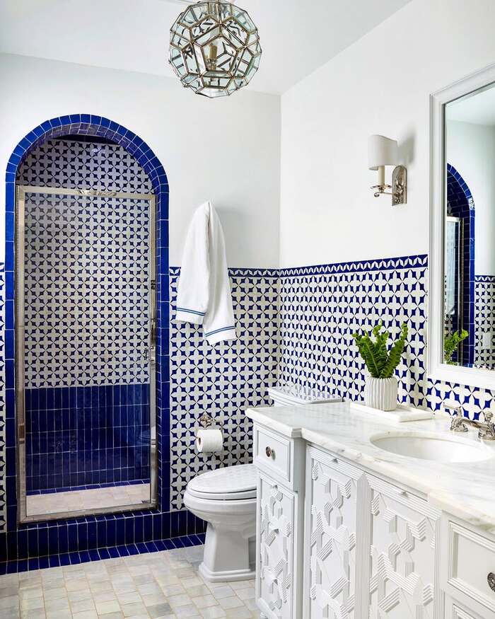 This bath wraps nearly everything in crisp patterns, yet it still feels tidy. The trick is contrast. Pair the busy blue & white tiles with a clean countertop and straightforward mirror. I once mixed patterned floor and patterned vanity at the same time. Chaos. Painting the vanity solid fixed it. Learn from my mild disaster.