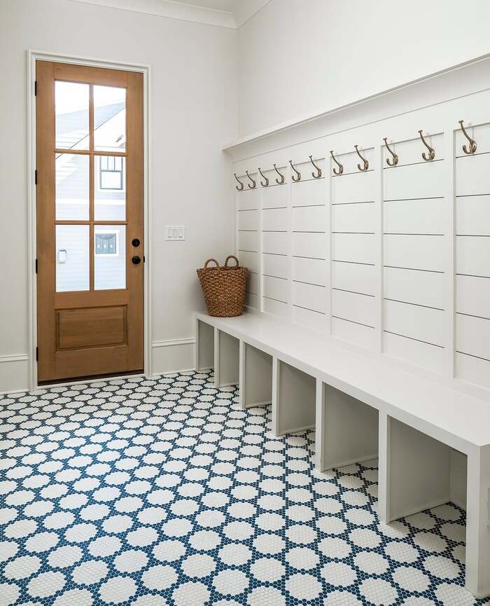 Penny rounds making white circles over navy are cute and serious at the same time. Great for kids, dogs, and all the shoes. Grout in soft gray, not white, unless you love scrubbing forever. This variation of blue-and-white tiles fits farm, coastal, even modern. I’d add wood hooks to warm it up.