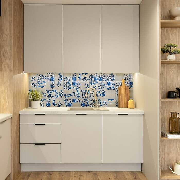 Those leafy squares look like little watercolor swipes. They wake up flat cabinets without shouting. Run the blue and white tiles two or three inches past the uppers so the edges finish clean. Seal grout twice if you cook a lot. Oil sneaks in like a ninja. This soft pattern belongs in my 10+ blue and white tile list for small spaces.