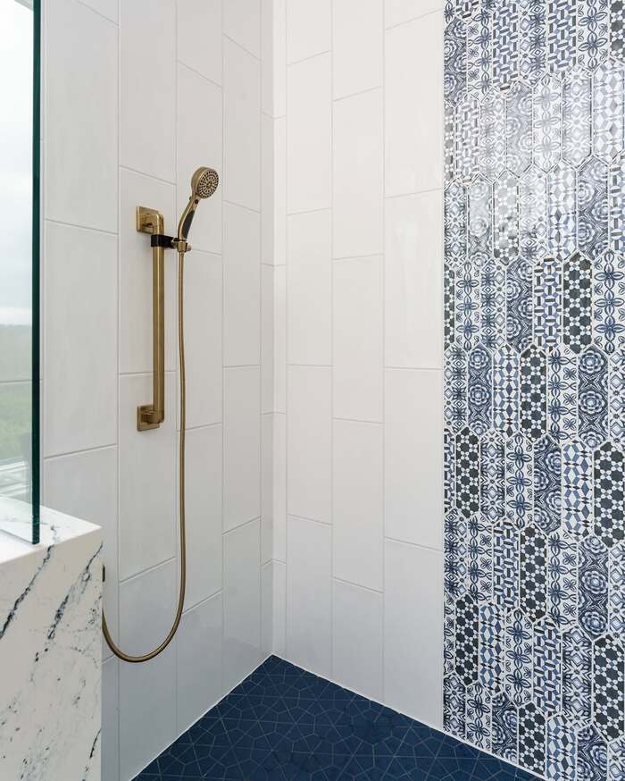 A plain white shower gets a tall stripe of patterned white and blue tile. Instant height. Add a navy floor to ground it. Use navy grout on that floor so tiny dirt lines vanish. Budget win, design win. Another easy entry in the 10+ blue and white tile family for folks who want style fast.