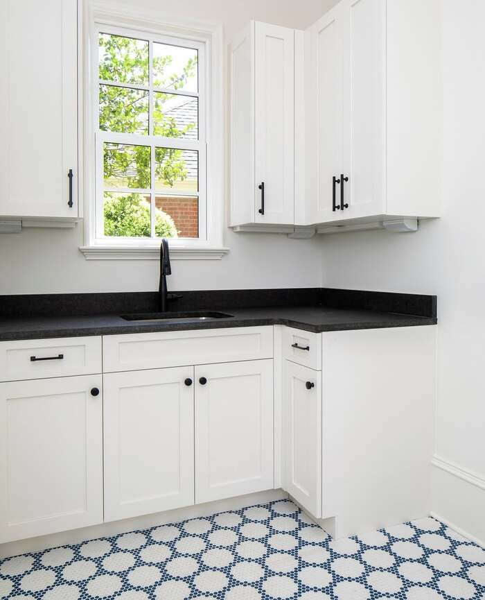 Diamonds and dots on the floor bring pep to laundry days. Black hardware keeps things from getting too sweet. If you want calm, go warm white walls and light counters. A framed print with sky tones ties the blue white tile to the rest of the room. Simple and cheerful.