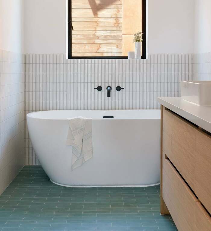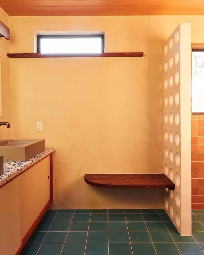 Handmade squares in dusty blue plus honey wood and cinnamon towels will warm your heart. Keep the rug fluffy but away from the drain. The slightly uneven blue-toned floor tile face hides crumbs and life very well.