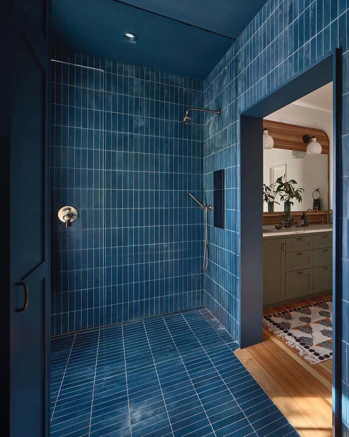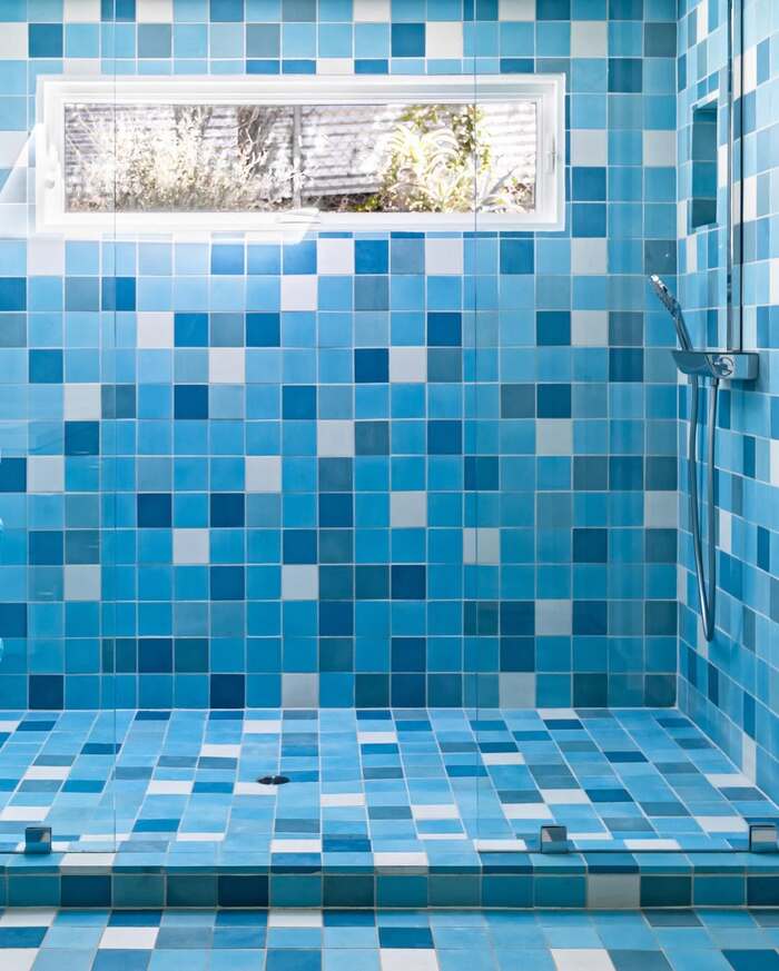 Multiple shades of sky make the shower look like pixels of water. Keep the squares small and repeat them on the curb for a seamless feel. This happy blue tiled floor loves white paint and simple shelves. If you want less scrub time, choose epoxy grout. It resists stains way better than cement.
